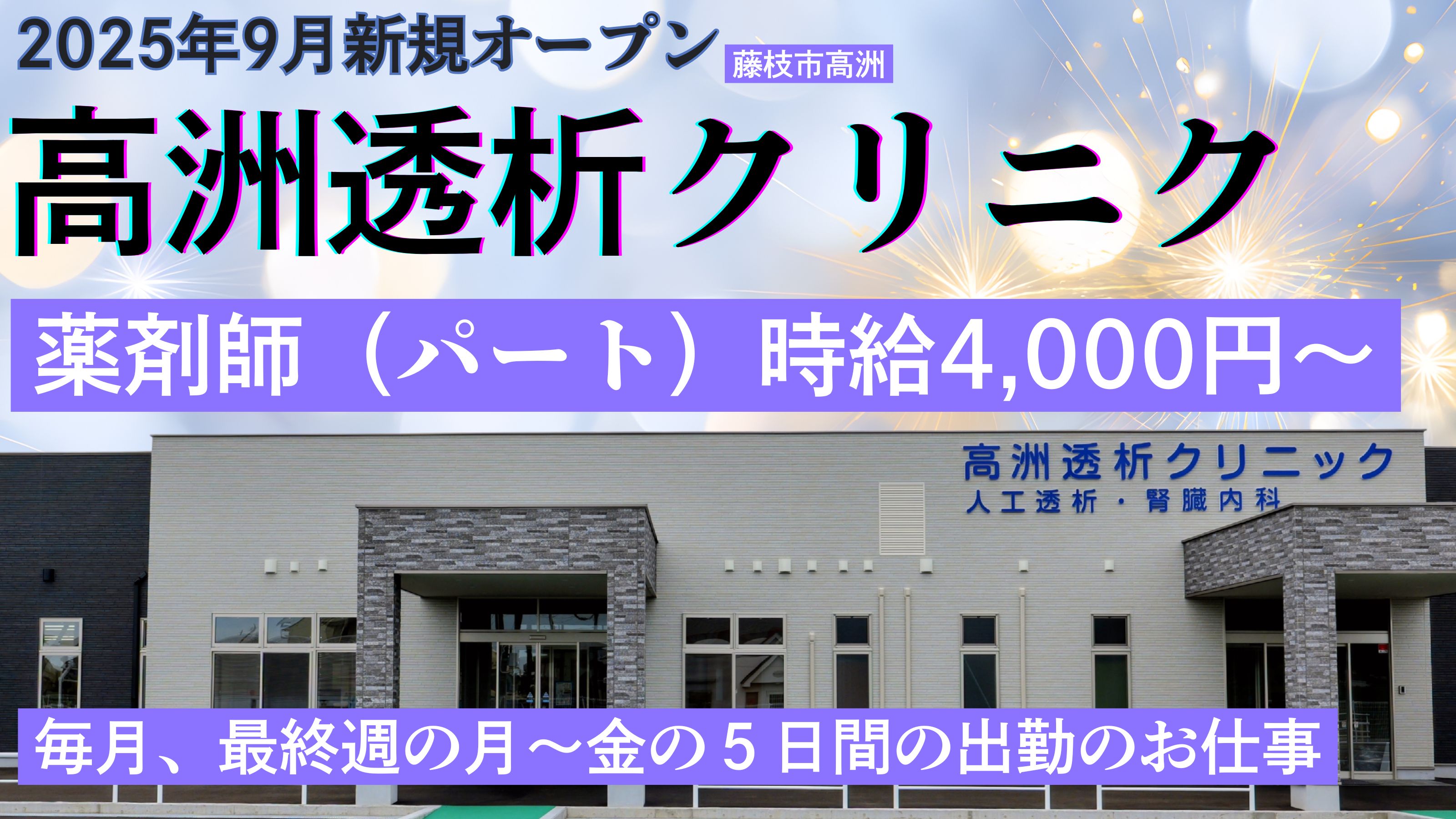 【薬剤師】【2025年9月新規オープン】JR藤枝駅から車で7分/透析クリニックでの薬剤師(パート)求人/毎月、最終週の月~金の5日間の出勤をお願いします